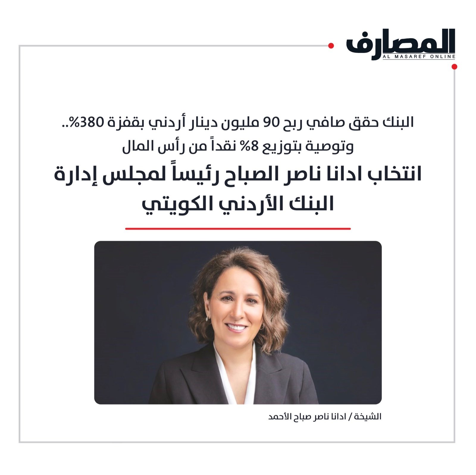 انتخاب ادانا ناصر الصباح رئيساً لمجلس إدارة البنك الأردني الكويتي