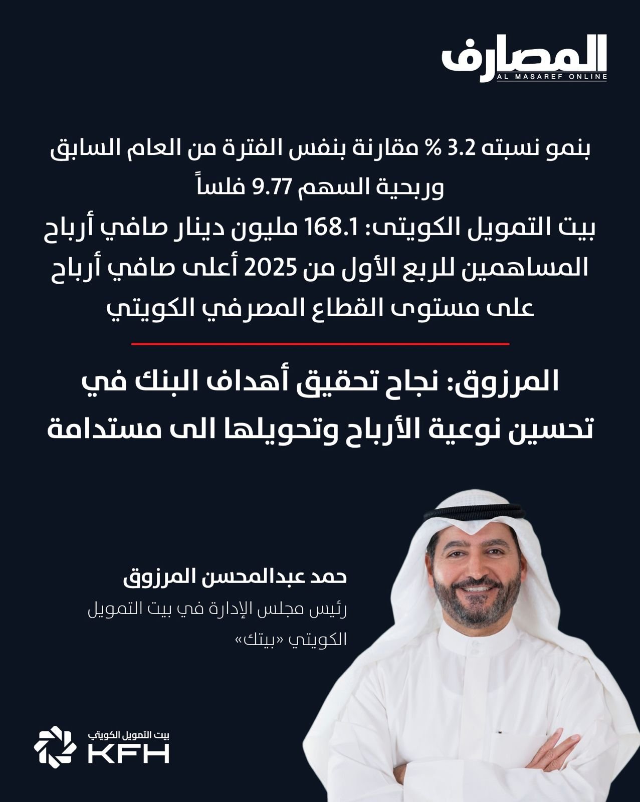 بيت التمويل الكويتى: 168.1 مليون دينار صافي أرباح المساهمين للربع الأول من 2025